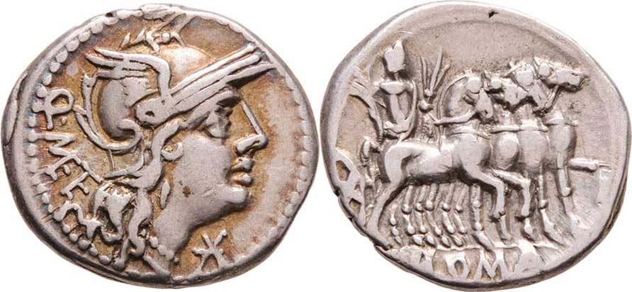 AR denár, hlava Romy zprava, "Q.METE.X." / Jupiter na quadrize zprava, nápis "ROMA.", Crawford.256/1, Alb.976, pěkná patina, téměř