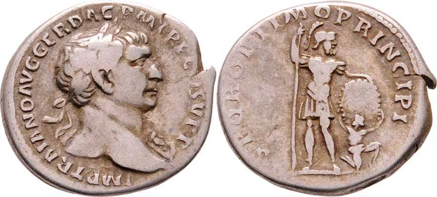 AR Denár, Rv:"SPQR.OPTIMO.PRINCIPI.", stojící Mars a zajatec držící štít, RIC.158 - ražba z let 103 - 111, nepravidelný okraj střížku, nep.nedor., pěkná patina
