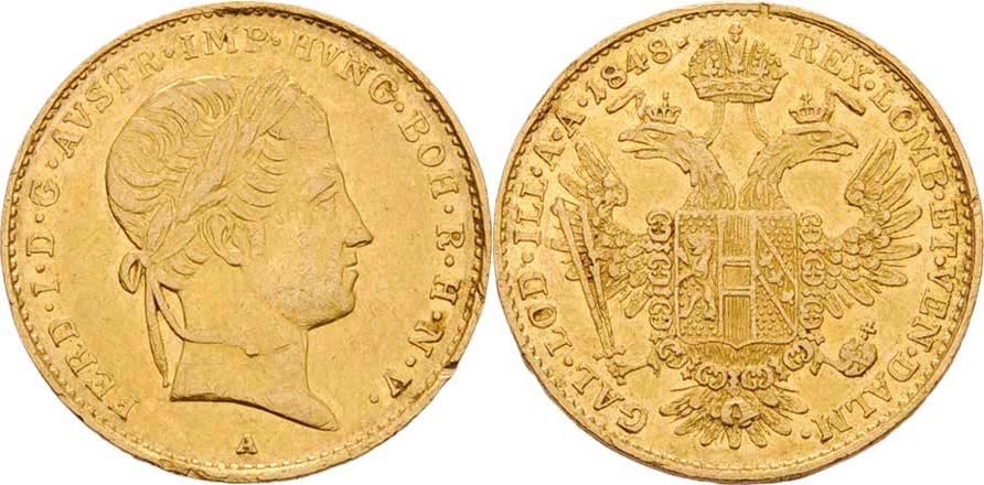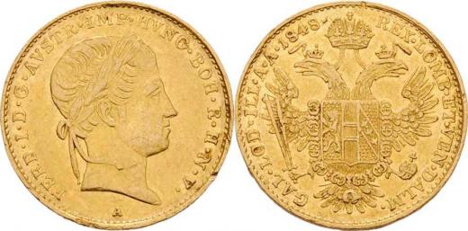 Dukát 1848 A, Vídeň, 3.476g, zvlněný, hrany, rysky, patina