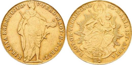 Dukát 1848 - s madonou a maďarským opisem - revoluční vydání, Kremnica, 3.441g, mírně zvlněný, stopa po oušku, dr.hr., dr.rysky, patina R!
