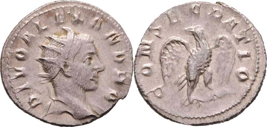 AR Antoninianus, Rv:"CONSECRATIO.", sedící orel, S.2184, RIC.97 - mincovna Mediolanum - ražba z let 249 - 251, nep.exc., pěkná patina R!
