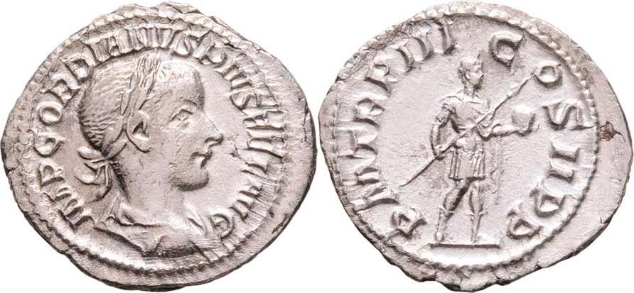 AR Denár, Rv:"P.M.TR.P.III.COS.II.P.P.", stoj. císař s kopím a globem, S.2374, RIC.115 - minc. Řím - ražba z let 241 - 243, pěkná patina RR!