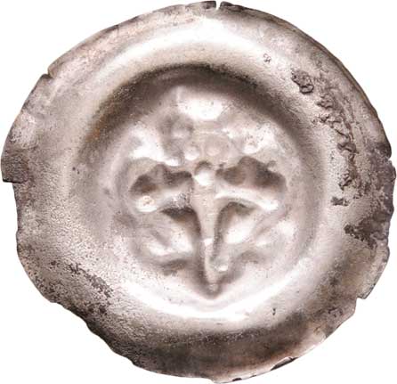 Brakteát český, Ca.856, F.XX/20 (text neuv.), 0.515g, nepravidelný okraj, skvrnky, patina