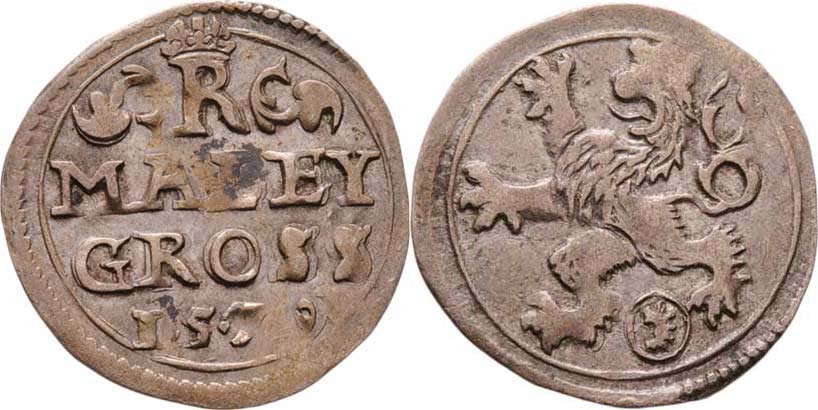 Malý groš 1579, K.Hora-Šatný, HN.1a (bez opisu), nápis " MALEY / GROSS / 1.5.7.9 ", 0.958g, nep.nedor., nep.dvojráz, pěkná patina