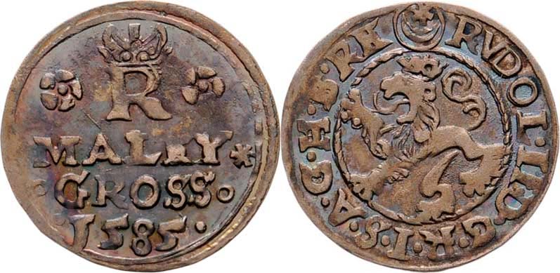 Malý groš 1585, Jáchymov-Hoffmann, HN.7a (opis 7b), nápis "* MALEY */o GROSS o/. 1585 .", 0.948g, nep.exc., nep.nedor., pěkná patina