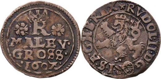 Malý groš 1602, Jáchymov-Taubenreutter, HN.9 (7c), nápis ". MALEY ./. GROSS ./. 1602 .", 1.004g, nep.nedor., nep.dvojráz, pěkná patina
