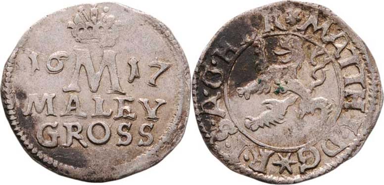 Malý groš 1617, K.Hora-Hölzl, HN.3a (opis 3a), nápis " 1617 / MALEY / GROSS ", 1.215g, nedor., skvrny, patina R!