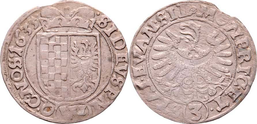 3 Krejcar 1635, Vratislav-Rieger, MKČ.1146, podobný jako ČS.621, 1.076g, nep.nedor., nep.vylomený okraj, pěkná patina