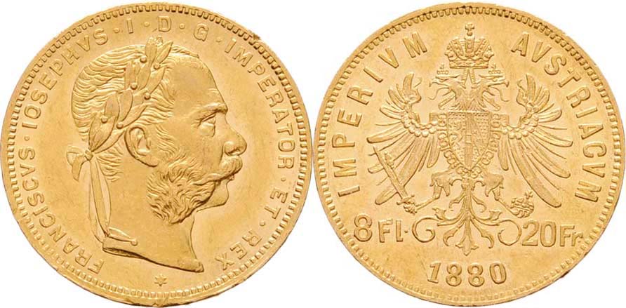 8 Zlatník 1880 (pouze 62.000 ks), 6.448g, dr.hr., dr.rysky, pěkná patina, téměř