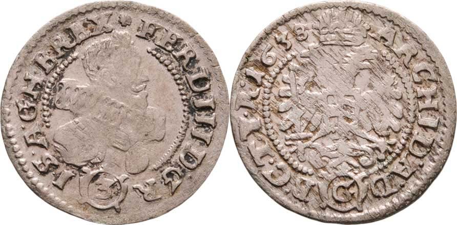 3 Krejcar 1638 G, Georg Hübner, NŠ.152, MKČ.1337, 1.584g, dr.vady materiálu, nep.nedor., pěkná patina