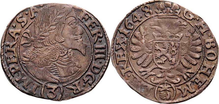 3 Krejcar 1648, Praha-Wolker, J.3b, MKČ.1181, 1.627g, oválný střížek, nep.nedor., pěkná tmavá patina, téměř
