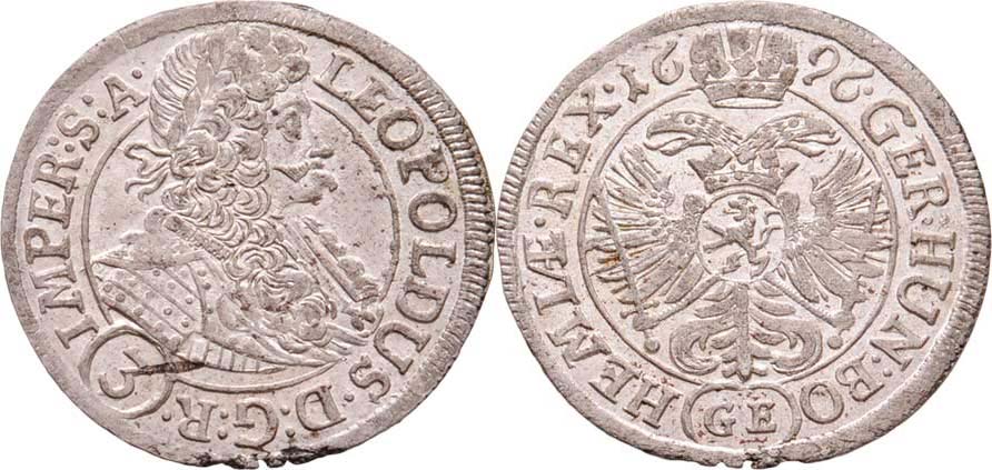3 Krejcar 1696, Praha-Egerer, Nech.206, MKČ.1425a, 1.658g, dr.vady materiálu na hraně, skvrnka, téměř