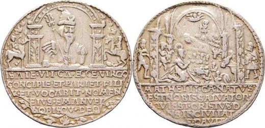 Vánoční medaile b.l. - portrét v klobouku, dva jezdci a 5-řádkový nápis / narození Páně, pětiřádkový nápis, jako FW.I.164, zlacené lité Ag, 42mm, 25.872g, rys R!