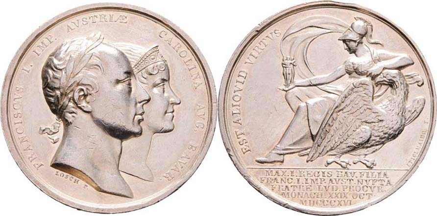 Losch a Sticlmaier - AR zásnubní medaile 29.X.1816 - dvojportrét zprava, opis/ sedící Aténa a orel, písmo, Ag 41mm, 29.227g, M.2461, H.3448, hr., rysky