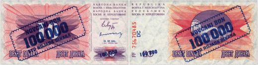100.000 Dinárů 10.11.1993, Pick.34b - přetisk na 10 Dináru