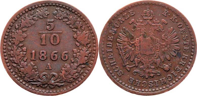 5/10 Krejcaru 1866 A, 1.542g, nep.hr., skvrnky, patina R!