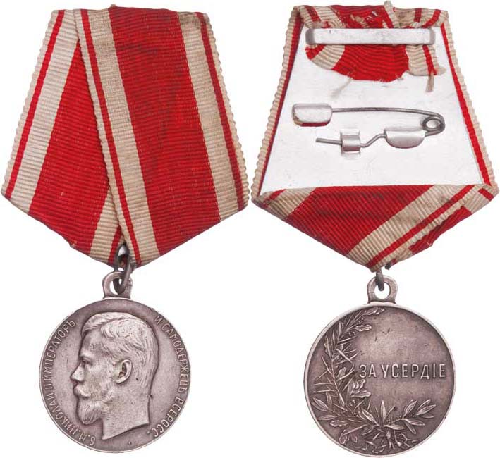 Ag medaile Za userdie (horlivost), OK.242, Ag 30 mm s původním raženým ouškem, stuha v barvách řádu Sv.Stanislava navinutá na pozdější hliníkové kolodce