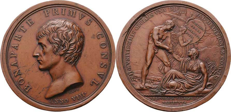 Lavy - založení Cisalpinské republiky An.8 (1800) - poprsí zleva, opis / Herkules pozvedá Itálii, písmo, Sign., měď 53mm, 63.773g, dr.vady mat., pat., tém. R!