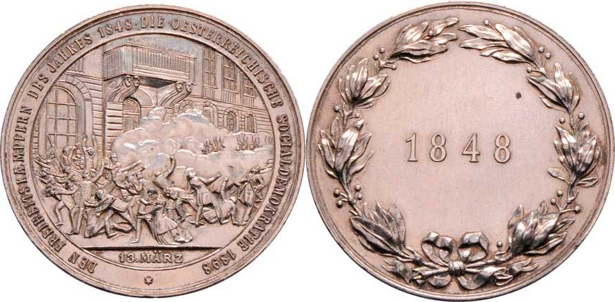 Rak. sociální demokracie - 50 let revoluce 1848/1898 - střetnutí občanů s vojskem, průčelí budovy, opis / letopočet ve věnci, Nesign., postř.měď 50 mm, patina