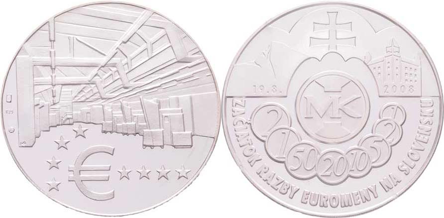 Začátek ražby euromincí na Slovensku 19.8.2008 - znak, Kriváň, Bratislavský hrad, mince, opis / hala mincovny, Nesign.(Poldaufová), Au925, (27.0g), karta