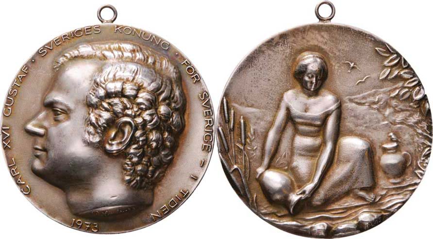 Carl XVI. Gustav - AR korunovační medaile 1973 - hlava zleva, opis / žena nabírá vodu, Sign.Linde, Punc., Ag999.5, 50mm, 76.800g, č.2196/3000, pův.ouško