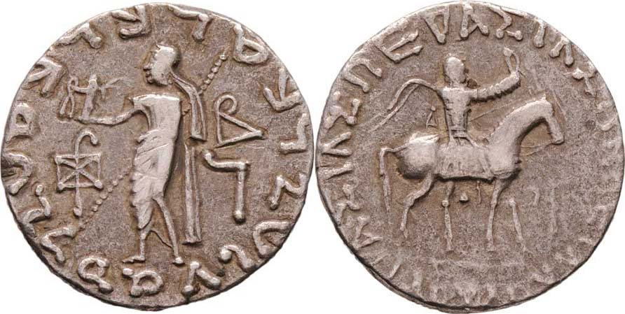 AR Tetradrachma, král na koni, opis / stojící Zeus, opis, monogramy, mincovna Taxila, MA.2399, 9.192g, nedor., pěkná patina