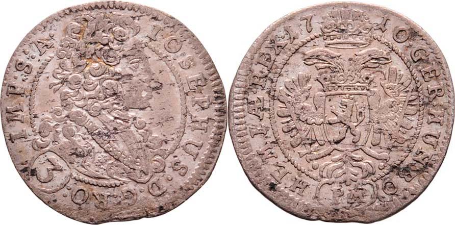 3 Krejcar 1710, Praha-provizorium, J.7a, MKČ.1723, 1.737g, krajový střížek, dr.vady mater., pěkná patina