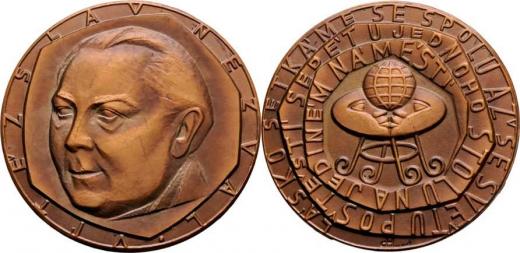 Vítězslav Nezval b.l. - hlava částečně zleva, opis / globus na stolku, opis ve spirále, Sign., patinovaný bronz 60 mm