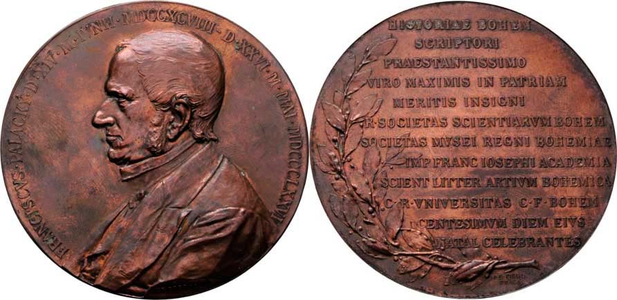 František Palacký - 100 let narození b.l.(1898) - poprsí zleva, latinský opis / vavřínová ratolest a 12-řádkový nápis, Sign., bronz 58 mm, etue