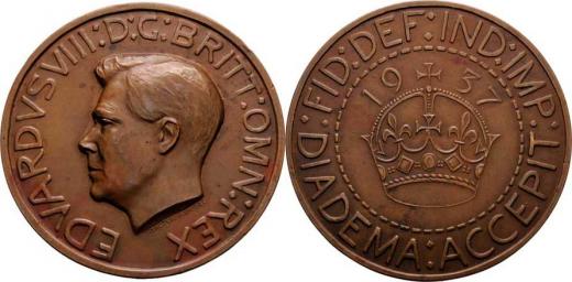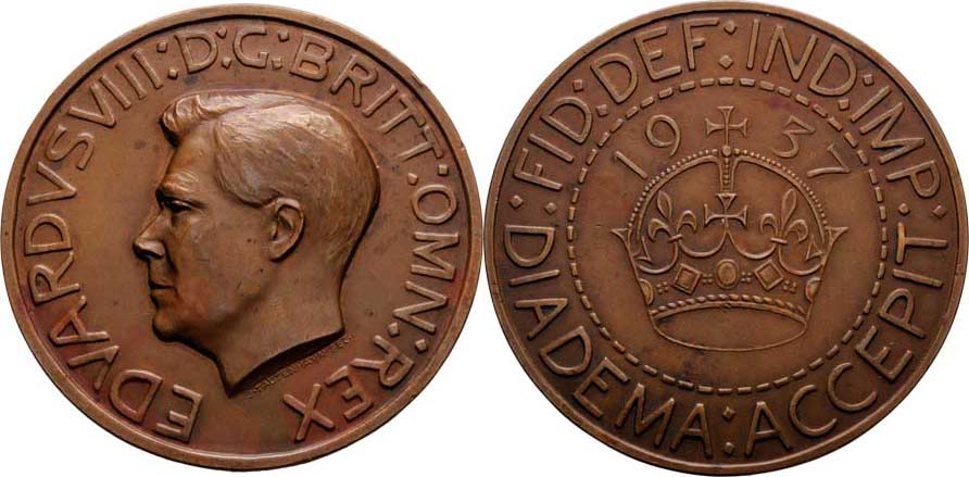 Edward VIII. - AE korunovační medaile 1937 - hlava zleva, opis / koruna, vročení a opis, Sign., patinovaný bronz 60 mm, dr.hr., dr.rysky
