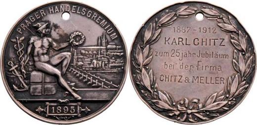 J.S. - Pražské obchodní gremium 1895 - sedící Merkur, pohled na Prahu, vročení a opis/ 5-řádkový rytý nápis ve věnci, Sign., Ag 55mm, 39.219g, díra, hrany, pat.