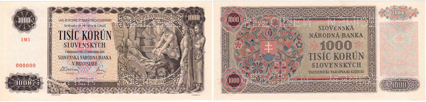 1000 Koruna 1940, série 1M1, BHK.51s, Kar.47a, anulát - bank. vzor "000000", perf. 4x zrcadlově "SPECIMEN"
