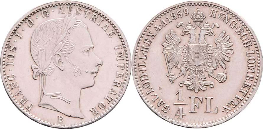 1/4 Zlatník 1859 B, 5.332g, nep.hr., nep.rysky, nep.just., téměř