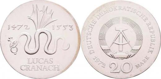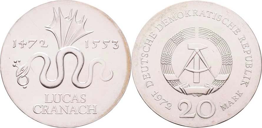 20 Marka 1972 - Lucas Cranach, KM.41 (Ag625, 20.9g, 100.000 ks), zcela nepatrné rysky, pat., kartička R!