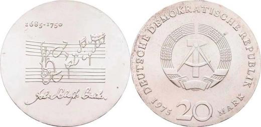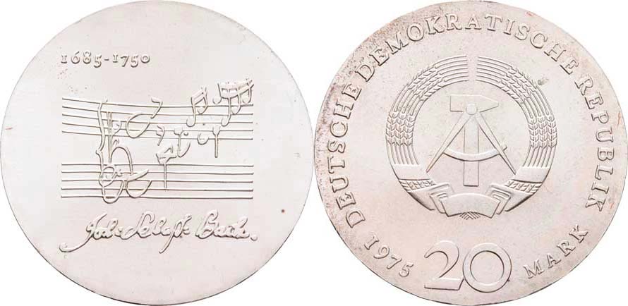 20 Marka 1975 - Johann Sebastian Bach, KM.59 (Ag625, 20.9g, 100.000 ks), skvrnky, patina, kartička R!