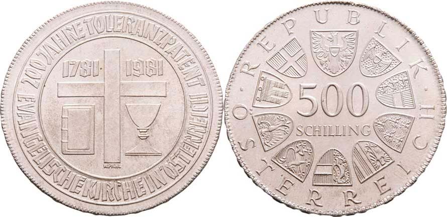 500 Šilink 1981 - 200 let Tolerančního patentu, KM.2954 (Ag640, 24.00g), patina