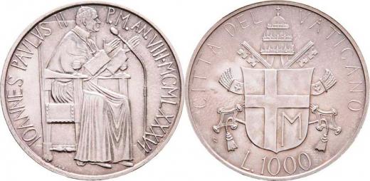 1000 Lira 1986 R - VIII.rok pontifikátu, Y.198 (Ag835, 14.6g, 80.000 ks), patina