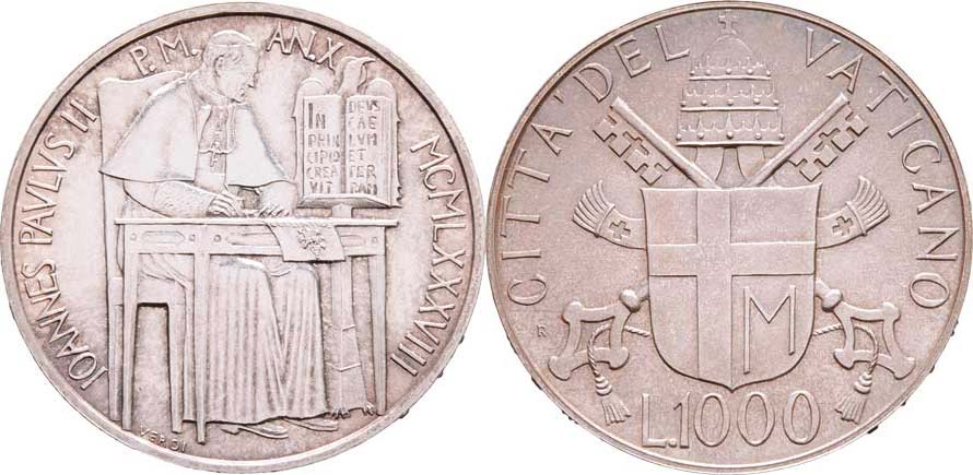 1000 Lira 1988 R - X.rok pontifikátu, Y.212 (Ag835, 14.6g, cca 80.000 ks), patina