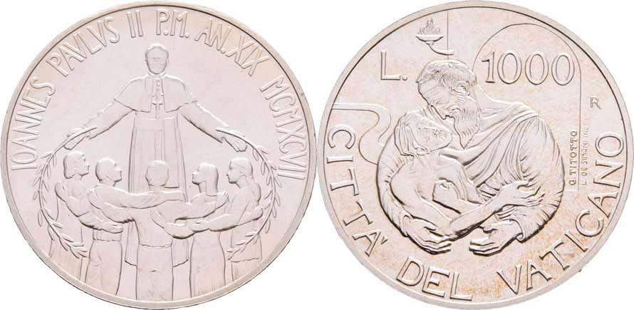 1000 Lira 1997 R - XIX.rok pontifikátu, Y.287 (Ag835, 14.6g, cca 80.000 ks)