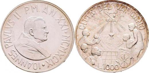 1000 Lira 1999 R - XXI.rok pontifikátu, Y.312 (Ag835, 14.6g), patina