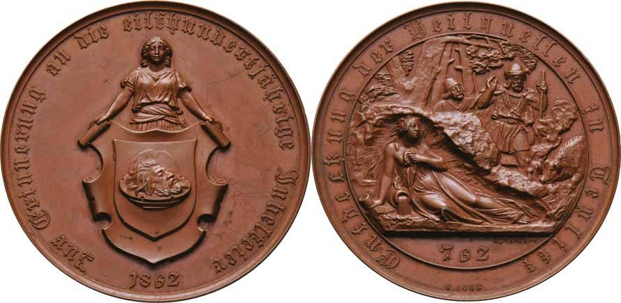Fischer a Loos - 1100 let objev. pramenů 1862 - znak města, něm. opis / scéna objevení pramenů, něm. opis, Sign., měď 50mm, 63.446g, vlas.škr., krásná patina
