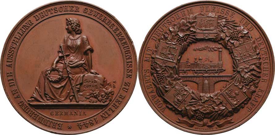 Loos, Lorenz, Schilling - živn.výstava v Berlině 1844 - sedící Germania zleva, opis / lokomotiva na mostě, bohatě zdobený věnec, opis, Sign., měď 44 mm, dr.hr.