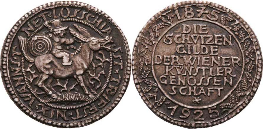 Vídeň 1925 - střelby Vídeňského uměleckého spolku - putti na oslu, terč, opis / vročení a 7-řádkový nápis ve věnci, Sign.HO, Nepunc., patin. Ag 26mm, 5.885g R!
