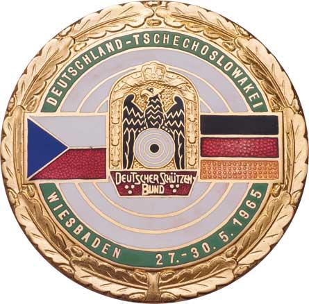 Wiesbaden 1965 - střel.závody Německo/Československo - znak spolku, dvě vlajky, opis a věnec, Nesign., zlacený a smalt. jednostranný bronz 70 mm, pův. etue
