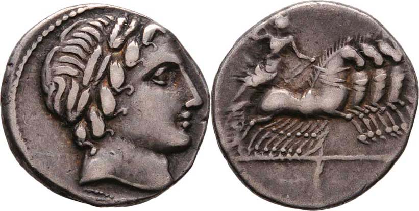 AR Denár, Hlava zprava / Jupiter na quadrize, bez nápisu, Crawford.350A/2, Alb.1223, nep.exc., patina