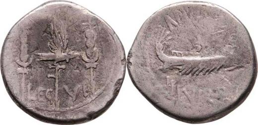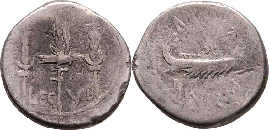 AR Denár, orel mezi standartami, nápis "LEG.VI." / galéra a opis "ANT.AVG.III.VIR.R.P.C.", Seaby.33, Crawford.544/19, Alb.1720, exc., nedor., škr., patina
