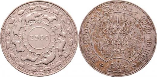 5 Rupie 1957 - 2500 let budhismu, KM.126 (Ag925), 28.170g, dr.hr., dr.rysky, pěkná patina