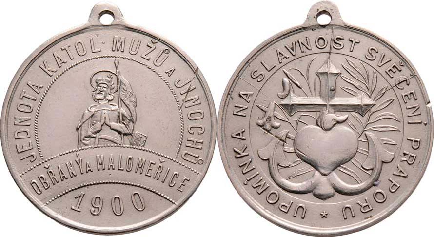 Svěc. praporu jednoty katolických mužů a jinochů 1900 - svatý Václav, opis a nápis / emblém jednoty, opis, bílý kov 34 mm s původním ouškem, vady razidla, škr.