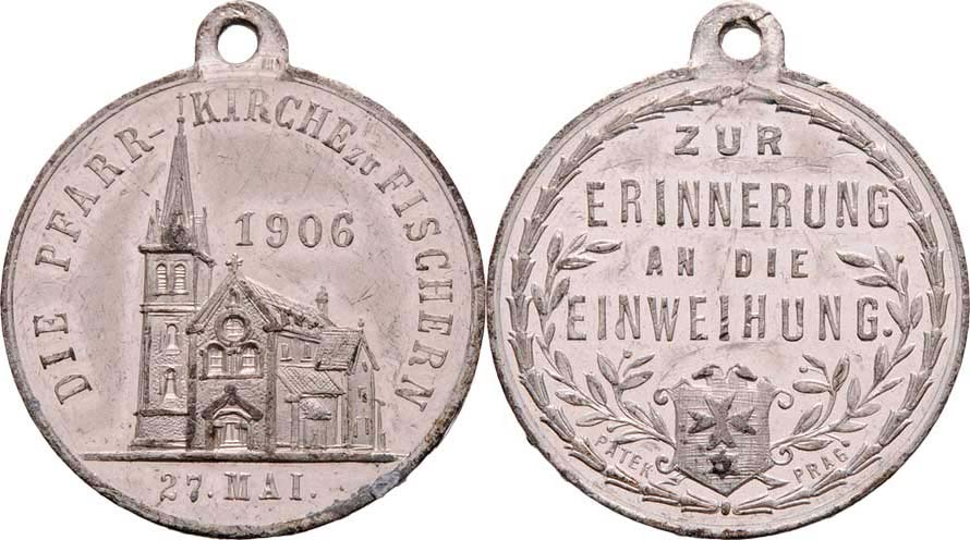 Svěcení farního kostela 27.V.1906 - kostel, vročení, opis / znak a nápis ve věnci, Sign.Pátek, cín 25 mm s původním ouškem, nep.rysky, patina