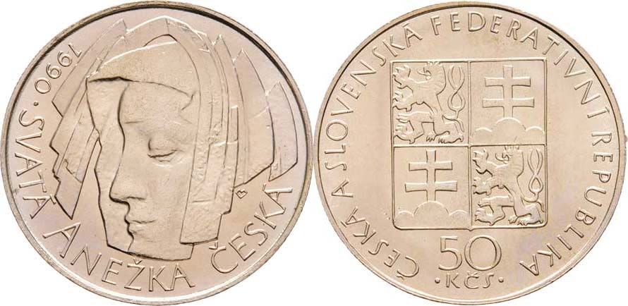 50 Kčs 1990 - svatá Anežka - bez signatury v aversu, 6.849g, patina, kapsle R!